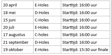 Onderstaand onze speeldata met starttijden eerste flight, reserveer deze alvast in jullie agenda's